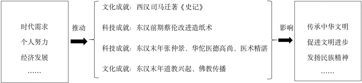 设计意图:通过回顾本单元所学,检测学生对历史知识的逻辑关系的理解情况。知道由于时代需求、个人努力、经济发展等原因推动两汉科技和文化取得诸多成就。科技和文化发展也巩固了两汉大一统、多民族国家。此外,民族交流的