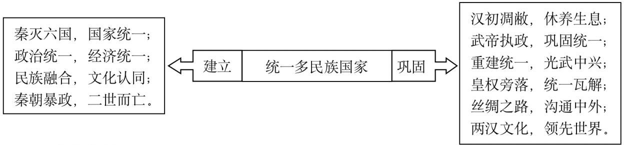 知道秦朝实现了中国历史上第一次大一统,秦朝实行的中央集权制度和一系列巩固统一的措施,对中国历史的发展产生了深远影响。创设历史情景,感受秦朝的暴政,知道秦朝灭亡的史实,理解西汉初期统治者实行休养生息政策的内容和效果。知道汉武帝统治时期大一统局面得到进一步巩固和发展。通过梳理东汉兴衰的基本脉络,认识中国古代社会盛衰的基本情况。通过阅读地图,知道丝绸之路对于东西方经济、文化交流的作用。通过对两汉时期科技和文化成果的学习,形成对中华优秀传统文化的认同,树立对中华文明的自信力和自豪感。