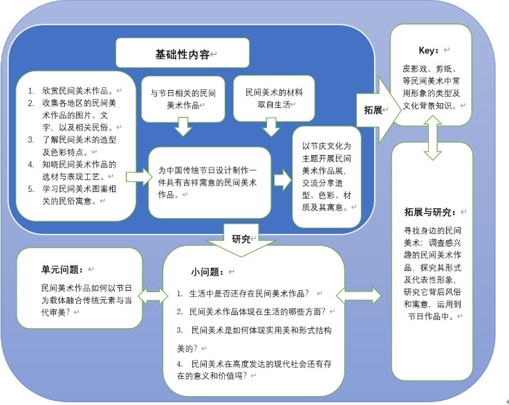 在具体教学上引导学生从跨学科、多领域的视角探索以节日为载体的民间美术相关作品,积极创设教学情境,合理利用教学资源,注重校园实践活动丰富性、体验性和有效性,能激发学习兴趣,形成艺术理解。设计由浅入深、层层递进、环环铺垫的单元活动和作业,重视问题引导、示范、模仿、比较、讨论等多种方