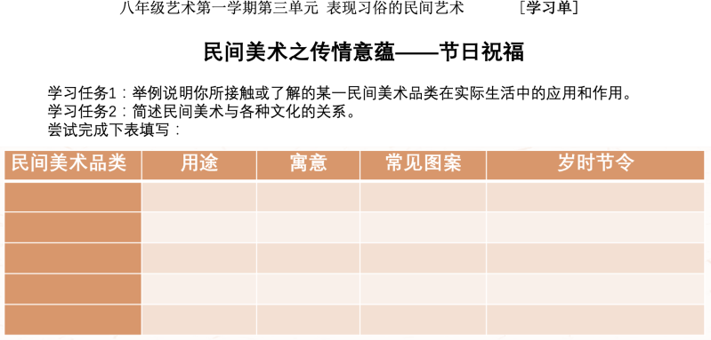 【设计意图】在知识领悟、创新实践、审美功能几方面体验民间美术“取之生活、用之生活”的创作乐趣。