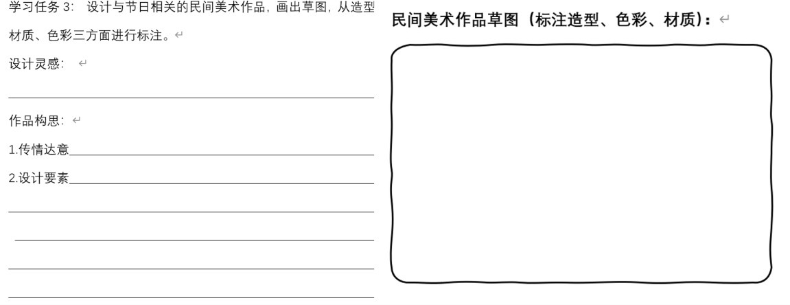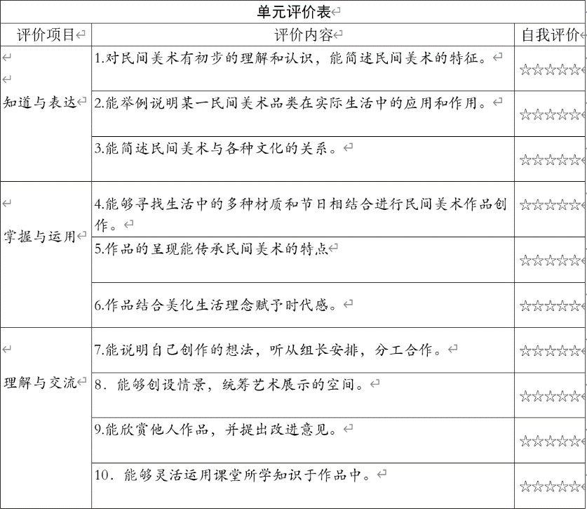 重点:能准确对民间美术品进行深入的欣赏评述;能运用所掌握的民间美术基本工艺完成学习任务;有主题的进行设计,绘制草图,写出创作意图。
