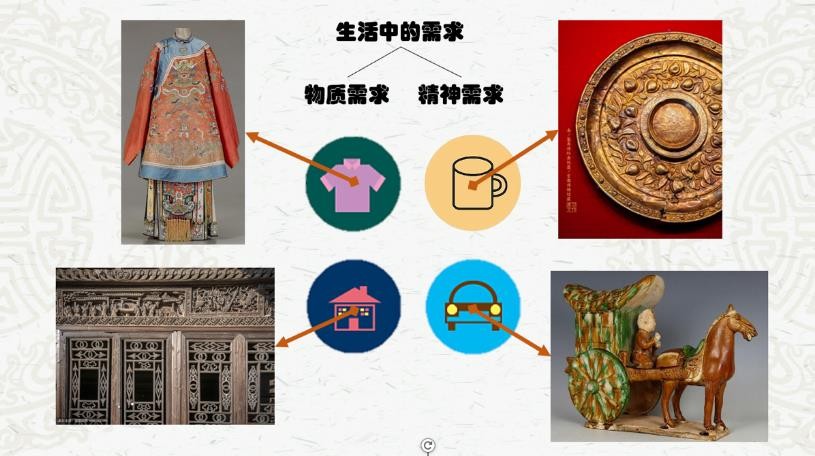 师:衣食住行都是生活中的实用(物质)需求,但是给它们加以造型、纹饰、色彩就表现了精神文化内涵。
