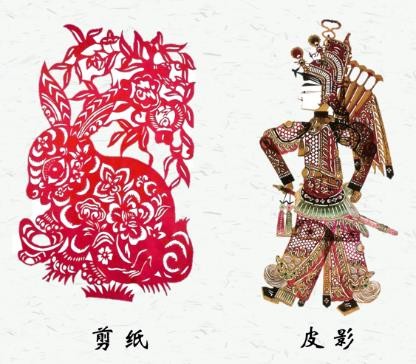教师出示剪纸、皮影作品,让学生进行对比分析两者共通之处。