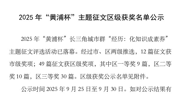 2025年“黄浦杯”主题征文区级获奖名单公示
