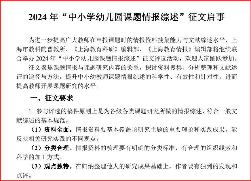 2024年上海市“中小学幼儿园课题情报综述”征文活动通知