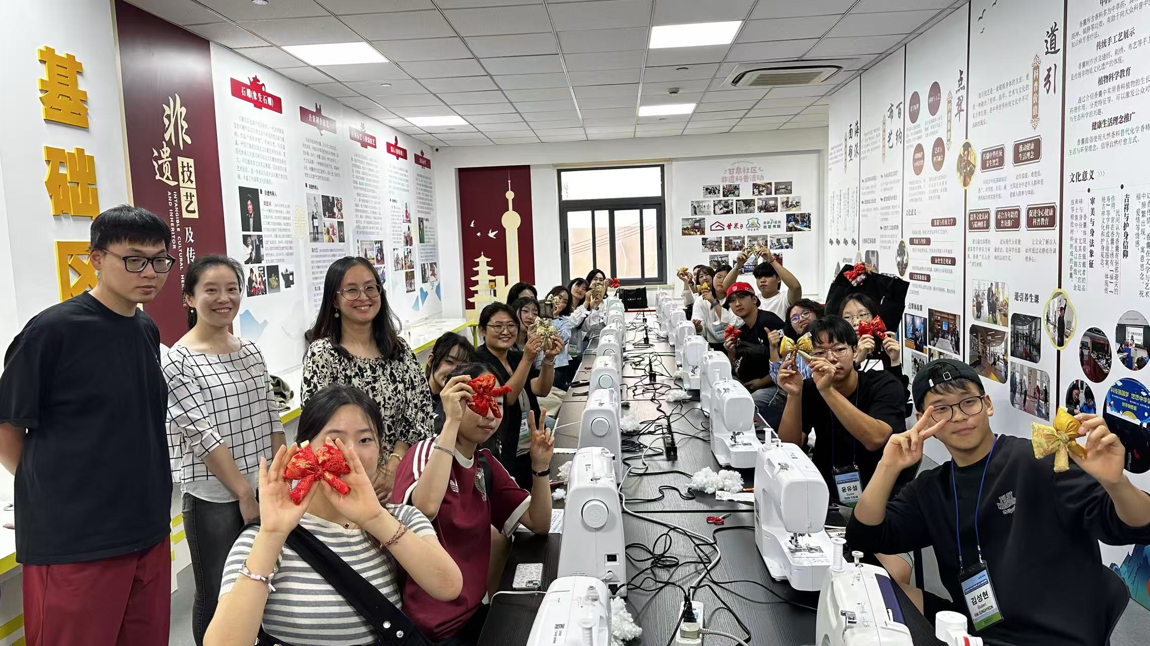 走出校园,釜山师生走进甘泉街道社区文化活动中心,亲身体验“市民日校”民乐课程,并动手制作非遗宋锦挂饰,在互动体验中感受上海社区生活的温度与非遗文化的魅力。在沪期间,师生们还走访了朱家角古镇、外滩、半马苏河段、新天地和城隍庙等地,通过实地探访感受上海的历史文脉、城市发展与人文风貌,深切体会这座城市的开放与包容。