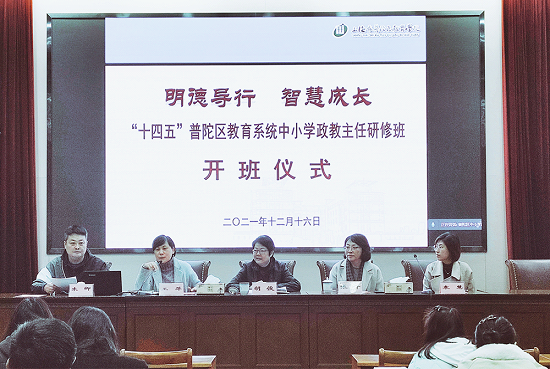 2021年12月16日上午,明德导行 智慧成长——“十四五”普陀区教育系统中小学政教主任研修班开班仪式在普陀区教育学院举行。普陀区教育工作党委书记胡俊、普陀区教育学院党总支书记张平、普陀区教育局基教科德育干部袁慧出席活动,会议由普陀区教育学院德育室主任王萍主持。