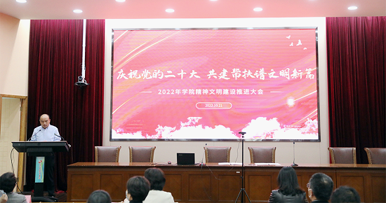 2022年10月21日下午,普陀区教育学院召开“庆祝党的二十大,共建帮扶谱文明新篇”2022年度精神文明建设推进大会。